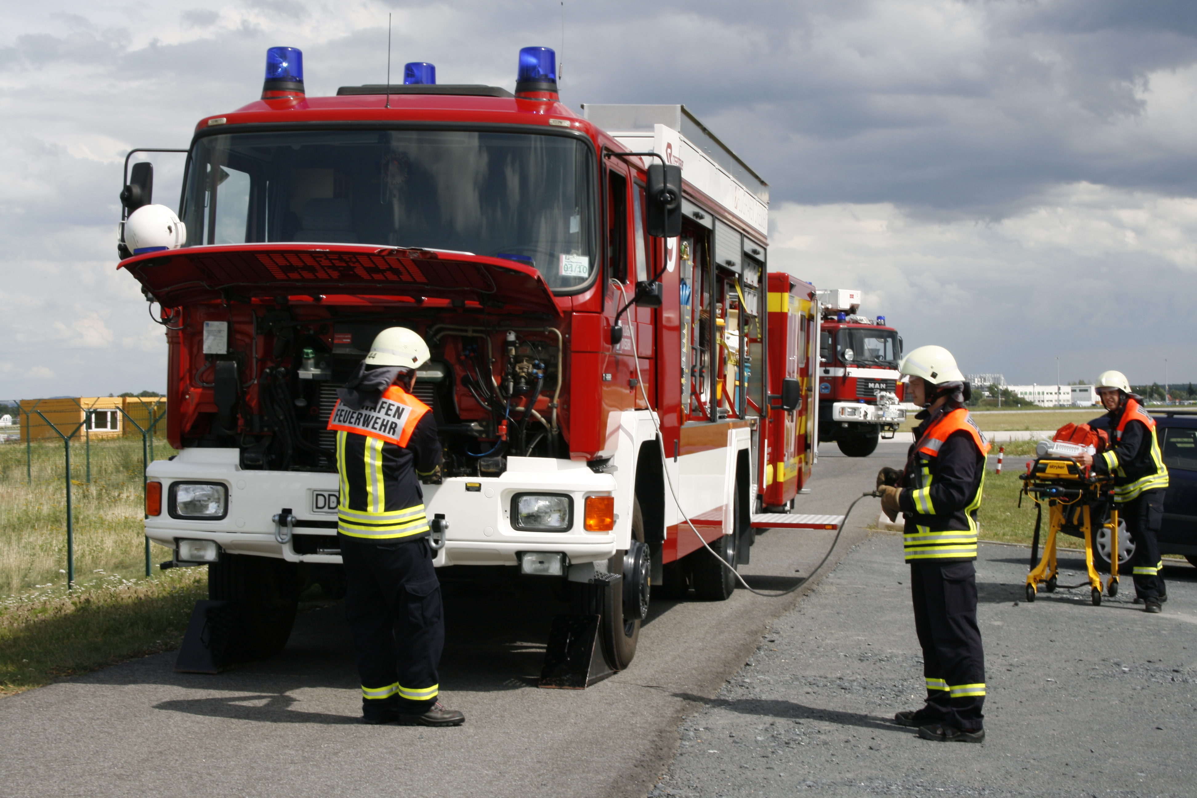 Um für den Ernstfall bei Flugunfällen sowie anderer Unfälle gut gerüstet zu sein, bedarf es intensiver Ausbildung der Kollegen bei der Flughafenfeuerwehr. Dafür wird in den Wachabteilungen ein Flughafenspezifischer Ausbildungsplan erstellt in dem theoretische und praktische Ausbildungen geübt werden können. Für theoretische Grundlagen bei Unfällen mit Flugzeugen steht den Kollegen der Flughafenfeuerwehr eine Modellanlage (siehe Bild 1) zur Verfügung. An dieser Modellanlage kann das richtige taktische Vorgehen bei Unfällen mit Flugzeugen geübt werden. Dabei können zum Beispiel unterschiedliche Landerichtungen, verschiedene Schadenslagen mit Flugzeugen dargestellt, und in der Theorie geübt werden. Um Ernstfälle unter realen Bedingungen üben zu können, werden regelmässige Einsatzübungen verschiedenster Art z. B. Löschübungen (siehe Bild 2), Technische Hilfeleistungen (siehe Bild 3), durchgeführt. Dazu kommen noch unangekündigte Übungen, bei denen die Schnelligkeit und Einsatztaktik im Vordergrund stehen. Alle 2 Jahre findet auf dem Flughafen eine groß angelegte Unfallübung statt, (siehe Bild 4) wo neben der Menschenrettung und Brandbekämpfung die Zusammenarbeit mit den anderen Rettungskräften der Stadt Dresden trainiert wird.